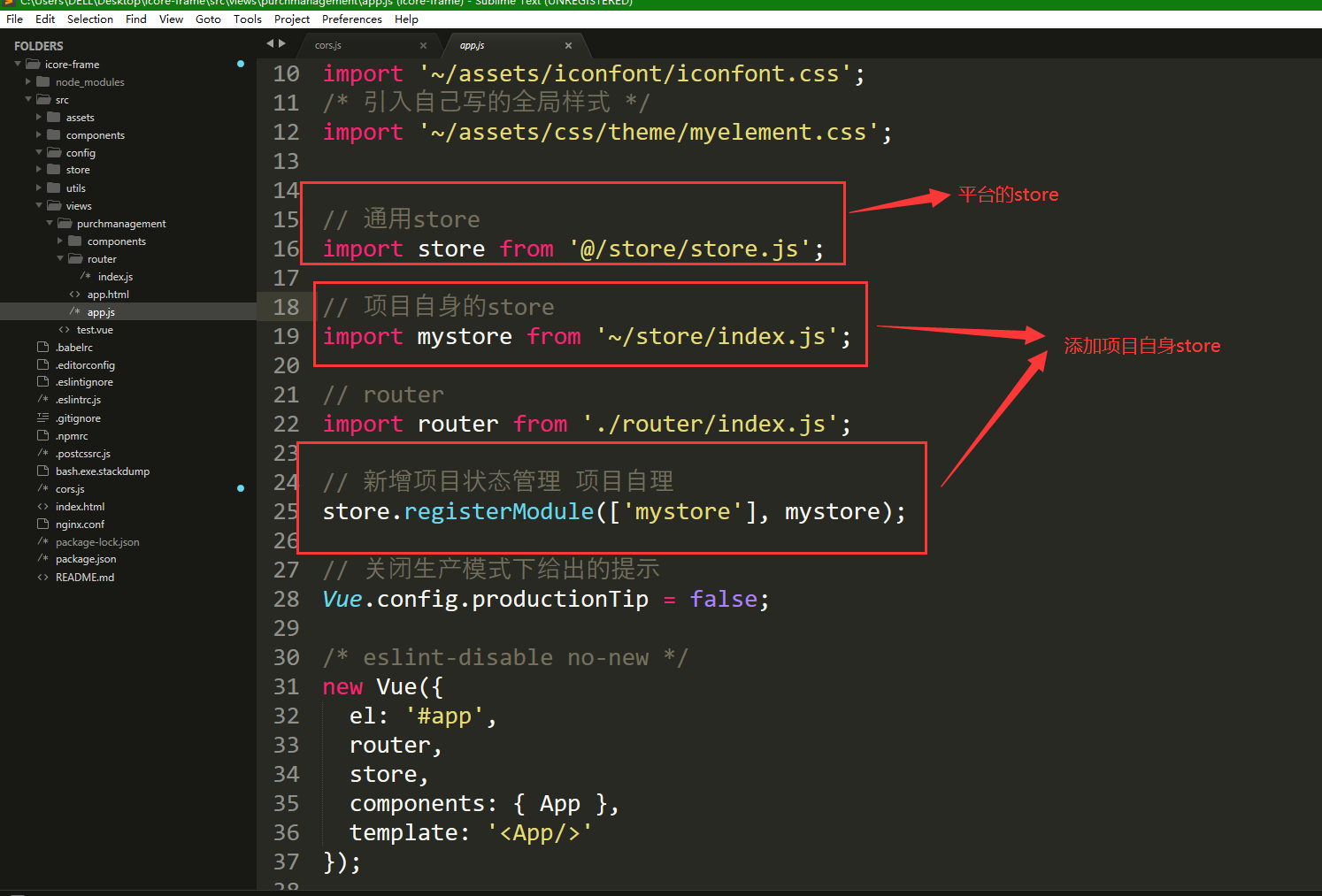 ① 若只是单纯需要引用平台定义的全局变量: 可直接在项目业务代码模块中app.js中引入(如下图),在vue页面中直接使用'this.$store.state.参数名'形式使用。