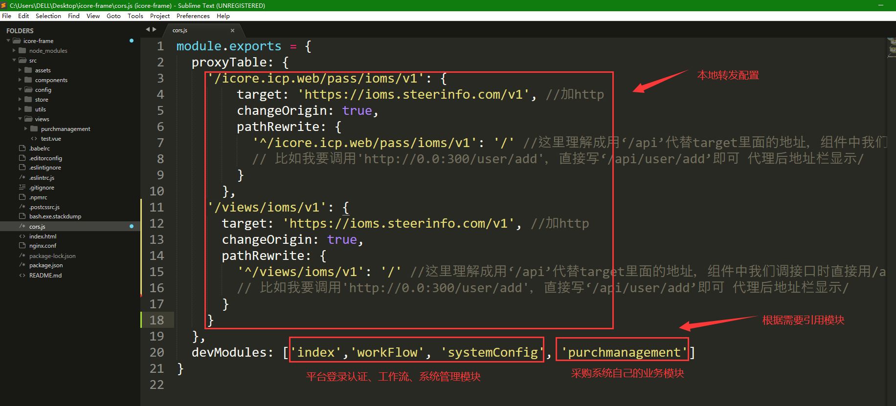 ③如需重写平台nginx配置(例如登录相关转发),在node_modules中找到icore-icp/config/index.js,复制sso相关配置到cors.js中重写转发的target。会覆盖原有nginx, 因此项目相关转发建议带项目相关编码,避免重复转发配置覆盖。
